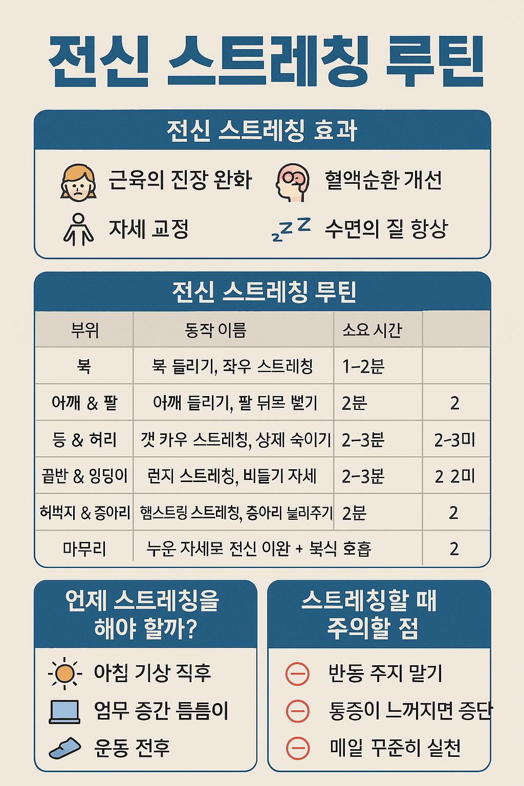 6. 전신 스트레칭 추천 루틴 예시 (하루 2회)