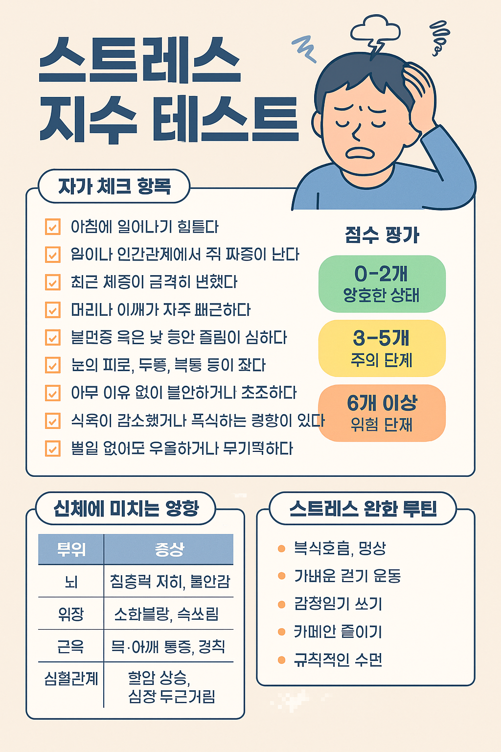 #스트레스지수테스트 #스트레스자가진단 #스트레스관리법 #마음건강 #정신건강관리 #스트레스해소 #우울예방 #피로회복루틴 #2030건강관리 #일상스트레스