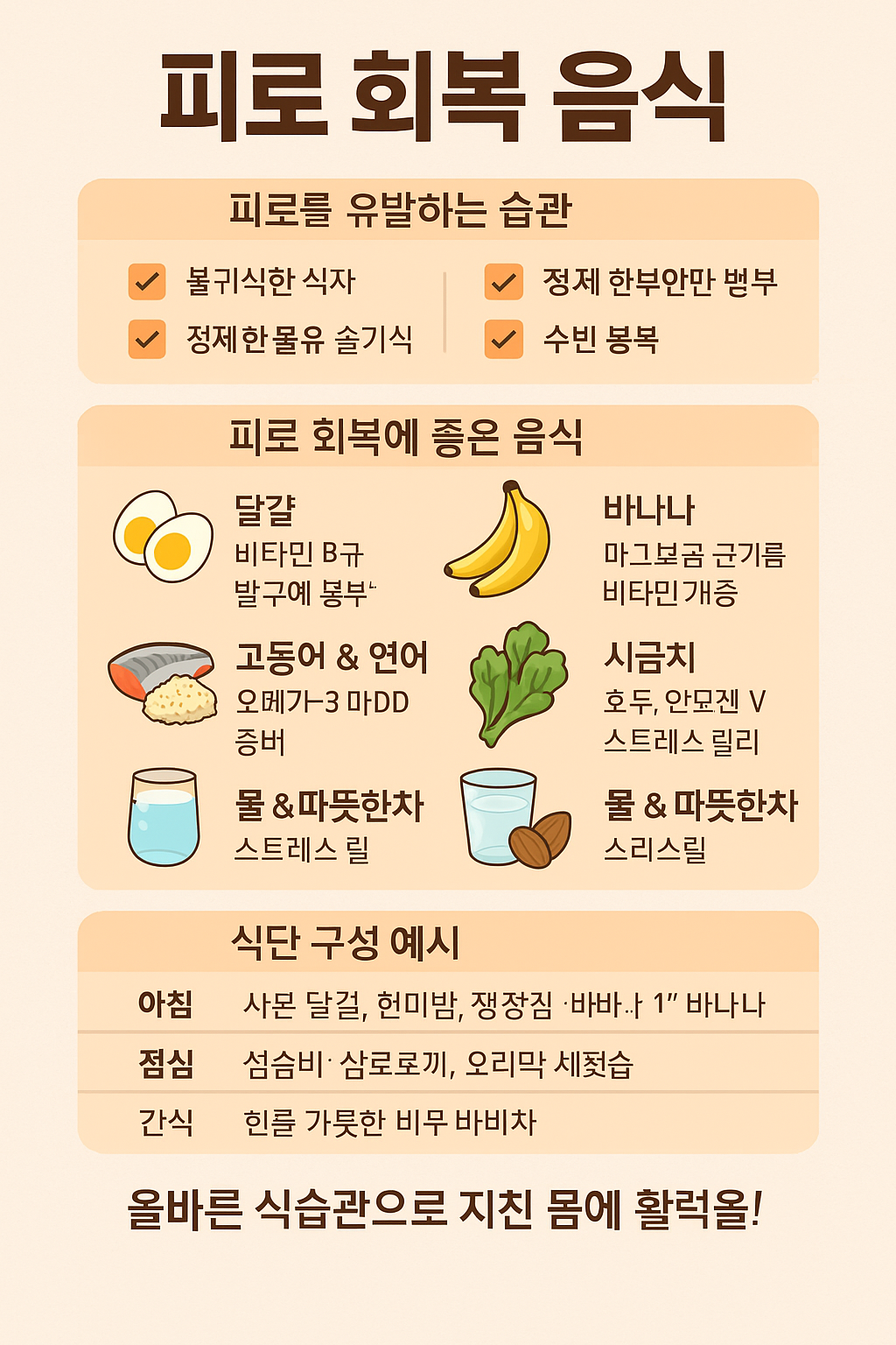 #피로회복음식 #에너지음식 #만성피로식단 #비타민B #건강한한끼 #현미식단 #바나나효과 #고등어영양 #피로해소식습관 #2030건강관리