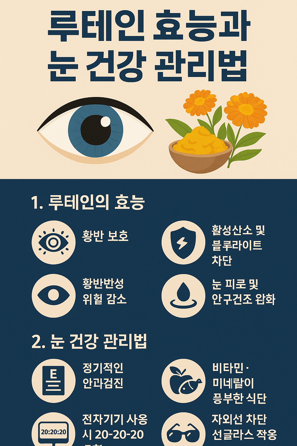 루테인은 이를 흡수하고 산화 스트레스를 줄여 시력 보호에 효과적입니다.